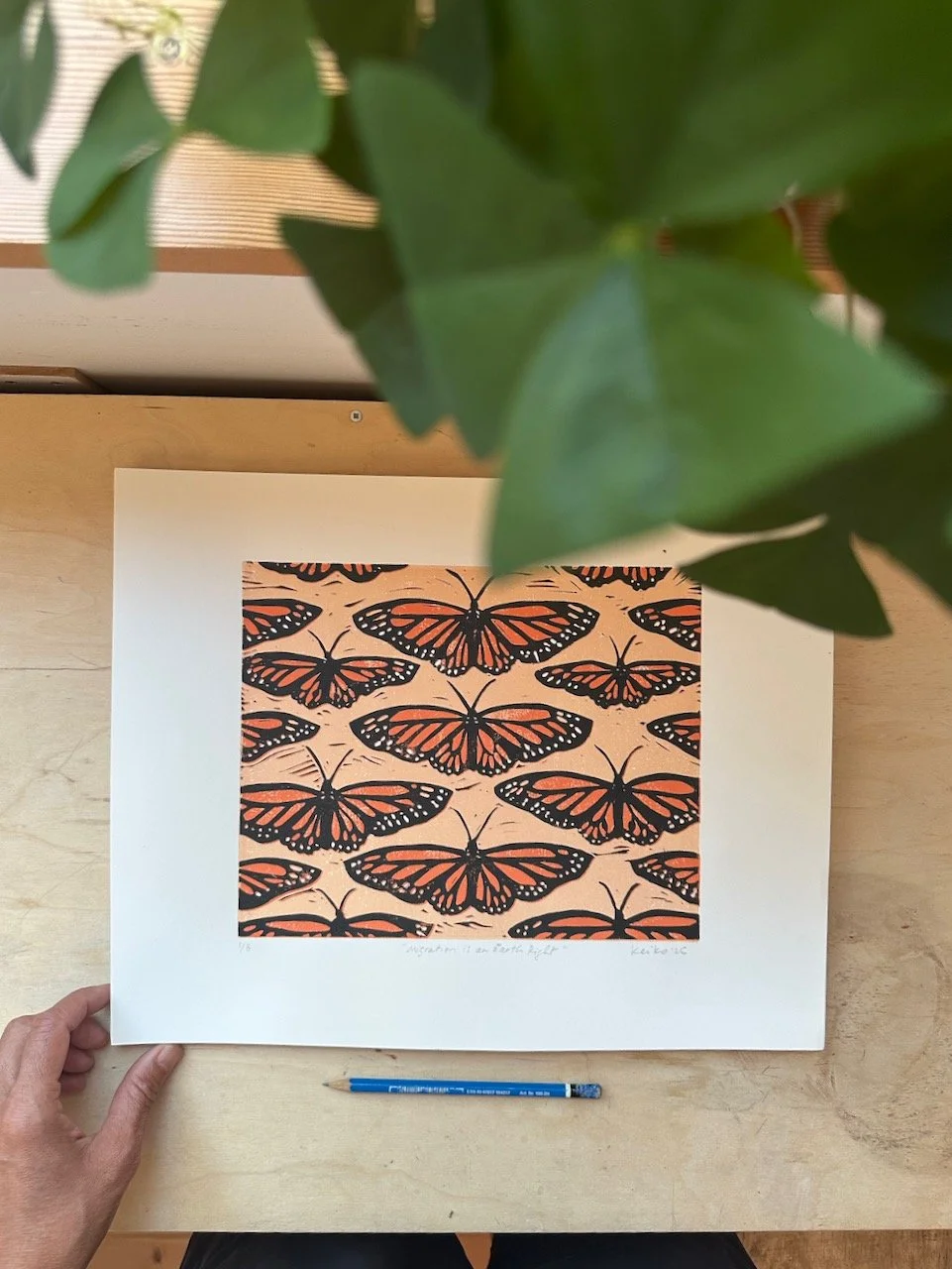 This year our theme was Belonging. My print “Migration is an Earth Right” depicts monarchs in flight, an example of migration that is common in nature.